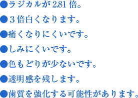 痛みが圧倒的に少なく、白さは従来の3倍、ラジカル2.81倍、短時間の施術で終了でき、